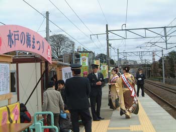 電車の到着を待つ梅大使さん (偕楽園臨時駅にて)