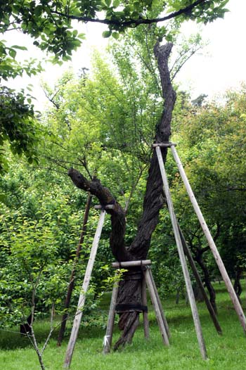 梅林では、つい最近まで数ミリほどだった梅の実が収穫目前にまでなりました。 老木も例外ではなく見事な実をつけています。 黒く光る樹皮、大きな裂け目とねじれ曲がった幹、朽ちた根元、あるものは支えられ、あるものは力をふり絞って一人で立っています。 「まだまだ」と言いながら。 春には芳香を放った老木達は、今、見事な実をつけています。 「そんなにがんばらなくてもいいのに・・・。」 生命線とされる樹皮さえもぼろぼろの根元から、我が子のために必死に養分を送り続けているのです。 木の葉のやさしい緑と、黒く光る鉄幹のたくましさの対比をお楽しみ下さい。 |