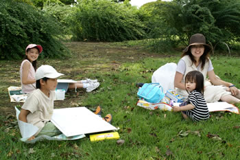 猛暑の中で写生するはなちゃん、真季ちゃん、亮太君
