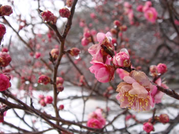 雪に見舞われた紅梅 1 雪が水滴に変わりはじめて (2008.2.3 撮影)