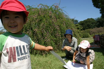 風にゆれる萩の間で写生をしているゆうきくんとくるみちゃんをパチリ。ステキな絵に仕上げてね。